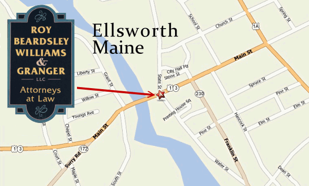 Our office is located at 6 Water Street in Ellsworth, Maine (on the corner Main and Water streets). Call 207-667-7121 to make an appointment with any of our Attorneys. Get driving directions from MapQuest by clicking on this link. Office hours: 8:00 - 4:30, Mon-Fri.